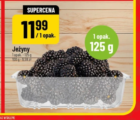 Jeżyny 1 opak. - 125 g 100 g - 9,59 zł Świeże jeżyny to doskonały dodatek do deserów, koktajli i śniadań, bogate w witaminę C i przeciwutleniacze, wspierające odporność organizmu. Wykorzystaj je do przygotowania pysznych konfitur, dżemów czy kompotów, a także jako zdrową przekąskę prosto z opakowania, idealną na letnie upały. Owoce te są również cennym źródłem błonnika, wspomagającym prawidłowe funkcjonowanie układu trawiennego i dbającym o zdrową florę jelitową.