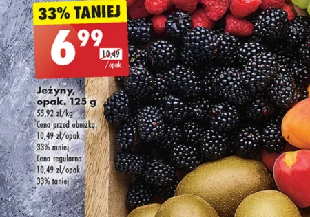Jeżyny, opak. 125 g 55,92 zł/kg Cena przed obniżką: 10,49 zł/opak., 33% mniej Cena regularna: 10,49 zł/opak., 33% taniej
