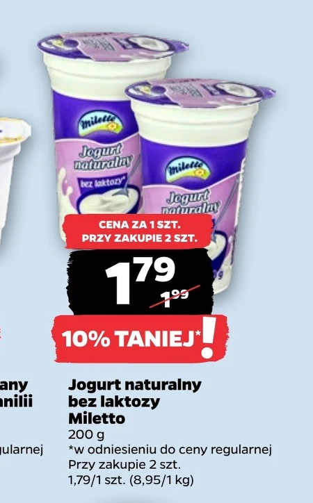Jogurt naturalny bez laktozy Miletto 200 g *w odniesieniu do ceny regularnej Przy zakupie 2 szt. 1,79/1 szt. (8,95/1 kg)