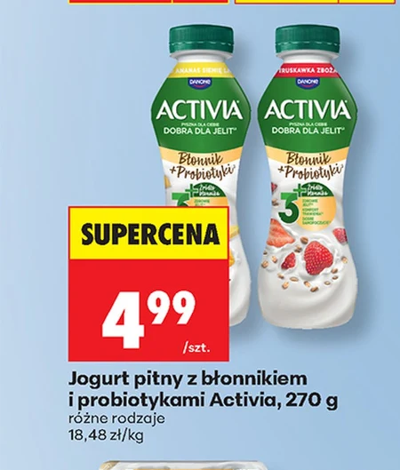 Jogurt pitny Activia z błonnikiem i probiotykami w Biedronce kosztuje 4,99 zł za opakowanie o gramaturze 270 g. Cena za kilogram to 10,48 zł. Dostępne są różne rodzaje tego jogurtu. Produkt można dodać do listy zakupowej, aby skorzystać z tej oferty w Biedronce.