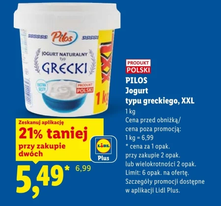 PILOS Jogurt typu greckiego, XXL 1 kg Cena przed obniżką/ cena poza promocją: 1 kg = 6,99 * cena za 1 opak. przy zakupie 2 opak. lub wielokrotności 2 opak. Limit: 6 opak. na ofertę. Szczegóły promocji dostępne w aplikacji Lidl Plus.