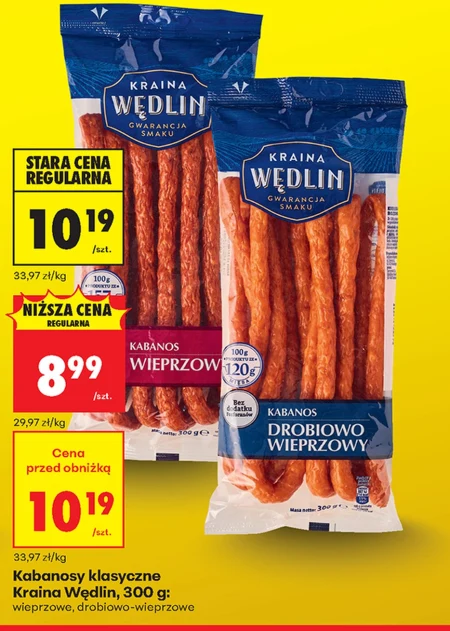 Kabanosy klasyczne, Kraina Wędlin, dostępne są w ofercie Biedronka w cenie 8,99 zł za 300 g, co daje 29,97 zł/kg – obniżka z 10,19 zł i 33,97 zł/kg. Produkt ten składa się z kabanosów wieprzowych oraz drobiowo-wieprzowych, idealnych jako szybka przekąska lub dodatek do kanapek. Kabanosy to propozycja dla osób ceniących tradycyjny smak i wygodę, świetnie sprawdzą się podczas spotkań ze znajomymi lub jako element podróżnej apteczki. Warto skorzystać z tej okazji i zaopatrzyć się w ulubione kabanosy w korzystnej cenie. Oferta ważna od 2026-04-10 do 2026-04-30 Źródło: gazetka Biedronka