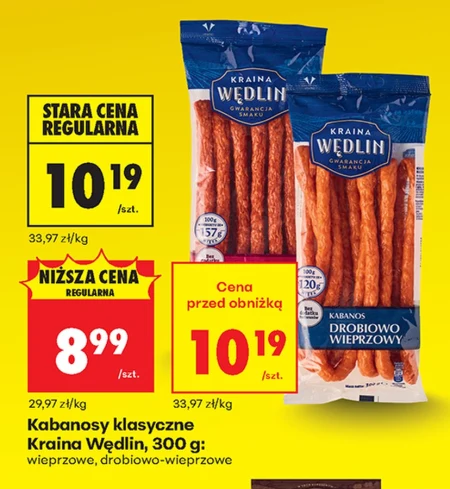 Kabanosy klasyczne, Kraina Wędlin, dostępne są w ofercie Biedronka w cenie 8,99 zł za opakowanie 300g, co daje 29,97 zł za kilogram. To wyrob wędliniarski na bazie mięsa wieprzowego oraz drobiowo-wieprzowego, idealny jako przekąska lub dodatek do kanapek. Kabanosy te występują w różnych gramaturach: 100g, 157g i 120g. Warto skorzystać z tej okazji, ponieważ cena została obniżona z 10,19 zł. Oferta ważna od 2026-04-13 do 2026-04-18 Źródło: gazetka Biedronka