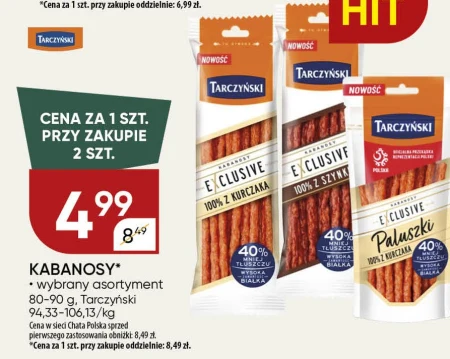 KABANOSY* · wybrany asortyment 80-90 g, Tarczyński 94,33-106,13/kg Cena w sieci Chata Polska sprzed pierwszego zastosowania obniżki: 8,49 zł. *Cena za 1 szt. przy zakupie oddzielnie: 8,49 zł.
