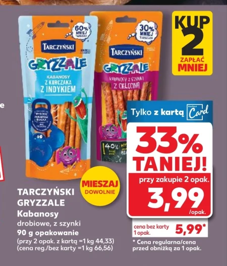 TARCZYŃSKI GRYZZALE Kabanosy drobiowe, z szynki 90 g opakowanie (przy 2 opak. z kartą =1 kg 44,33) (cena reg./bez karty =1 kg 66,56)