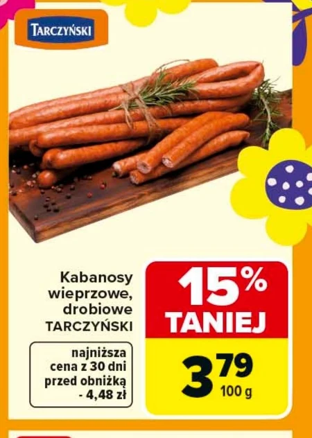 Kabanosy wieprzowe i drobiowe Tarczyński dostępne są teraz w Carrefourze w cenie 3,79 zł za 100 g. To najniższa cena w ciągu ostatnich 30 dni, obniżona o 15% względem poprzedniej. Oznacza to realną oszczędność 0,48 zł na opakowaniu. Kabanosy Tarczyński świetnie sprawdzą się jako szybka przekąska do pracy, szkoły lub na wycieczkę.
