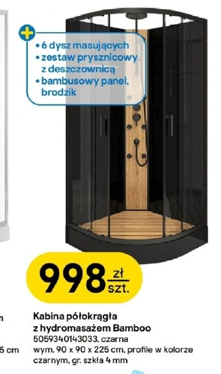 Kabina półokrągła z hydromasażem Bamboo jest dostępna w ofercie Castorama w cenie 998 zł. Charakteryzuje się wymiarami 90 x 90 x 225 cm i posiada profile w kolorze czarnym oraz szkło o grubości 4 mm. Kabina wyposażona jest w sześć dysz masujących, zestaw prysznicowy z deszczownicą oraz bambusowy panel i brodzik, co zapewnia komfort podczas kąpieli. To idealne rozwiązanie dla tych, którzy pragną relaksu i odprężenia w domowej łazience, a elegancki design w czarnym kolorze wpasuje się w nowoczesne wnętrza. Warto rozważyć tę ofertę, aby cieszyć się luksusowym komfortem hydromasażu w swoim domu. Oferta ważna od 2026-04-07 do 2026-04-21 Źródło: gazetka Castorama