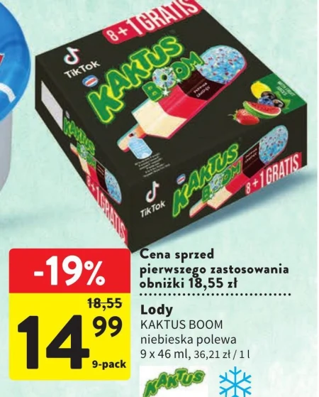 Lody KAKTUS BOOM niebieska polewa 9 x 46 ml. Cena sprzed pierwszego zastosowania obniżki 18,55 zł.