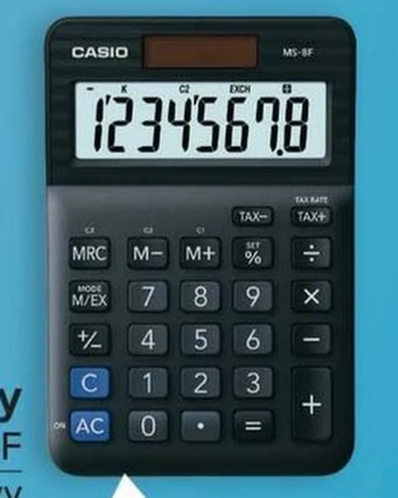 Kalkulator biurkowy CASIO MS-8F podwójne zasilanie, marżowy system obliczania %, obliczenia podatkowe TAX +/-, konwersja walut najniższa cena od wprowadzenia towaru - 39,99 zł