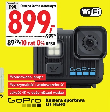 Kamera sportowa LIT HERO występuje w ofercie Media Expert w cenie 899,- zł, dzięki obniżce z 1199,- zł. Jest to korzystna okazja, ponieważ najniższa cena tego produktu w ciągu ostatnich 30 dni wynosiła 999,99 zł. Kamera oferuje wysoką jakość obrazu 4K w lekkiej obudowie, a także jest wytrzymała i wodoszczelna, co czyni ją idealną do nagrywania podczas aktywności sportowych i podróży. Posiada wbudowaną lampę oraz moduł WiFi, umożliwiający szybki transfer danych. Możliwość zakupu na 89,90 zł x 10 rat 0% RRSO sprawia, że jest to wyjątkowo atrakcyjna propozycja. Oferta ważna od 2026-04-09 do 2026-04-18 Źródło: gazetka Media Expert