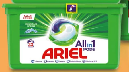 Ariel Allin1 zapewnia wyjątkową moc piorącą w jednej małej kapsułce. Kapsułki do prania Ariel Allin1 PODS Mountain Spring mają unikalną wielokomorową budowę, która sprawia, że składniki są od siebie odseparowane i nie łączą się ze sobą aż do chwili rozpoczęcia prania, dzięki czemu zapewniają wyjątkowo skoncentrowaną moc piorącą. Innowacyjna powłoka kapsułek do prania Ariel ulega całkowitemu rozpuszczeniu w kontakcie z wodą, uwalniając specjalne formuły, które pozwalają usuwać wiele różnych rodzajów plam. Kapsułki Ariel to najlepszy środek piorący Ariel w płynnej formie, zawierający odpowiednią ilość poszczególnych składników piorących. Użyj również płynu do płukania Lenor oraz perełek zapachowych Unstoppables do stosowania podczas prania, aby zapewnić swoim ubraniom jeszcze większą miękkość i świeżość. UWAGA. Ten produkt może być szkodliwy i powodować poważne obrażenia. Przechowuj kapsułki Ariel poza zasięgiem dzieci. Więcej informacji znajdziesz na stronie keepcapsfromkids.eu. 1 kapsułka na 1 pranie. Umieść kapsułkę w bębnie pralki i połóż na niej ubrania, aby skutecznie wykorzystać produkt.