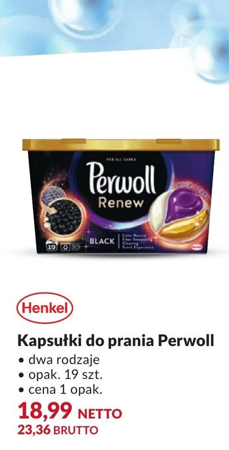 Kapsułki do prania Perwoll • dwa rodzaje • opak. 19 szt. • cena 1 opak. 18,99 NETTO 23,36 BRUTTO.