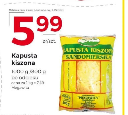 Kapusta kiszona 1000 g /800 g po odcieku cena za 1 kg = 7,49 Megawita Kiszona kapusta to doskonały składnik tradycyjnych potraw, takich jak bigos czy zupy, który nadaje im wyjątkowego smaku i aromatu. Dzięki wysokiej zawartości witaminy C i probiotyków wspiera zdrowie układu trawiennego oraz wzmacnia odporność organizmu.