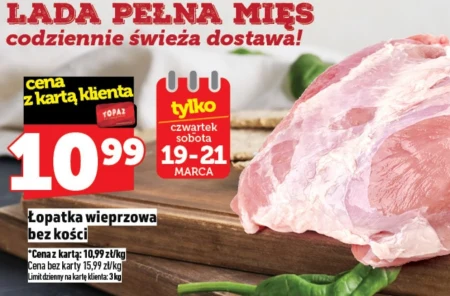 Łopatka wieprzowa bez kości cena z kartą klienta TOPAZ 10,99 *Cena z kartą: 10,99 zł/kg Cena bez karty: 15,99 zł/kg Limit dzienny na kartę klienta: 3 kg Łopatka wieprzowa bez kości w Topaz dostępna jest w atrakcyjnej cenie 10,99 zł/kg dla posiadaczy karty klienta, co czyni ją szczególnie opłacalnym wyborem. Mięso idealnie nadaje się do gulaszu, pieczeni, a także do przygotowania aromatycznych kotletów czy szaszłyków. Warto skorzystać z oferty, pamiętając o dziennym limicie 3 kg na jedną kartę klienta.