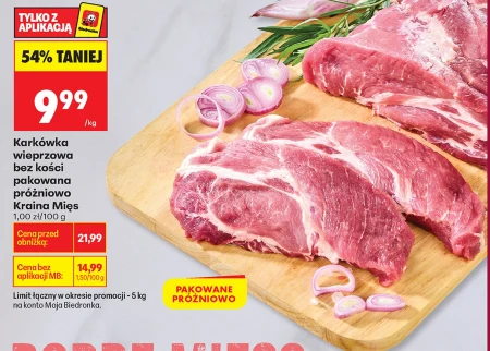 Karkówka wieprzowa bez kości od Kraina Mięs dostępna jest w Biedronce w cenie 9,99 zł/kg, co oznacza aż 54% obniżki względem ceny regularnej 21,99 zł. Pakowana próżniowo karkówka idealnie nadaje się do grillowania, pieczenia lub smażenia, a dzięki promocyjnej cenie w Biedronce możesz zaopatrzyć się w nią do 5 kg na swoje konto Moja Biedronka. Aktualna cena bez opłaty MB to 14,99 zł/kg.