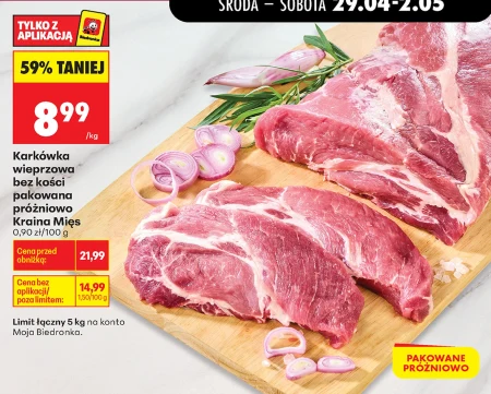 Karkówka wieprzowa bez kości, pakowana próżniowo z oferty Biedronki dostępna jest teraz w cenie 8,99 zł za kilogram. Regularna cena to 21,99 zł, a cena dla posiadaczy aplikacji Moja Biedronka wynosi 14,99 zł, jednak w promocji kosztuje jedynie 8,99 zł/kg. Limit zakupu wynosi 5 kg na jedno konto Moja Biedronka. Ten wysokiej jakości mięsny produkt idealnie nadaje się do przygotowania smacznych dań, takich jak steki, kotlety, gulasze czy pieczone mięso. Pakowanie próżniowe pozwala zachować świeżość i aromat karkówki przez dłuższy czas. To wyjątkowa okazja, aby zaopatrzyć się w dobrej jakości karkówkę w atrakcyjnej cenie i cieszyć się pysznymi posiłkami. Oferta ważna od 2026-04-29 do 2026-05-06 Źródło: gazetka Biedronka