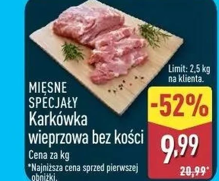 Karkówka wieprzowa bez kości występuje w ofercie Aldi w cenie 9,99 zł za kilogram, przy obniżce o 52% z ceny 20,99 zł. Limit zakupu to 2,5 kg na jednego klienta. Produkt ten idealnie nadaje się do przygotowania soczystych kotletów, gulaszu, czy też pieczeni, stanowiąc bazę wielu pysznych dań. To doskonała okazja, aby zaopatrzyć się w wysokiej jakości mięso w wyjątkowo korzystnej cenie. Oferta ważna od 2026-04-30 do 2026-05-02 Źródło: gazetka Aldi