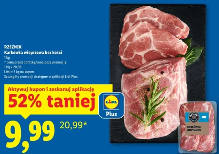 RZEŹNIK Karkówka wieprzowa bez kości 1 kg * cena przed obniżką/cena poza promocją: 1 kg = 20,99 Limit: 3 kg na kupon. Szczegóły promocji dostępne w aplikacji Lidl Plus. Karkówka wieprzowa bez kości doskonale sprawdzi się na grillowane dania, nadając mięsu soczystość i aromatyczny smak. Można ją również duszić lub piec, co pozwala uzyskać przepyszne, miękkie potrawy idealne na rodzinny obiad.