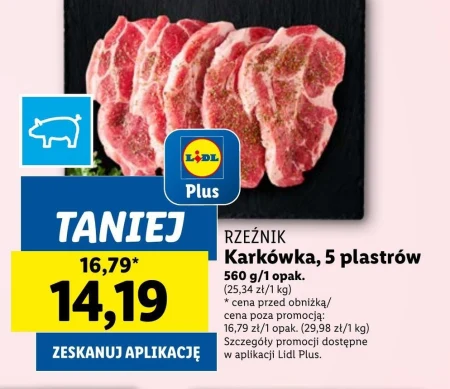 RZEŹNIK Karkówka, 5 plastrów 560 g/1 opak. (25,34 zł/1 kg) * cena przed obniżką/ cena poza promocją: 16,79 zł/1 opak. (29,98 zł/1 kg) Szczegóły promocji dostępne w aplikacji Lidl Plus.