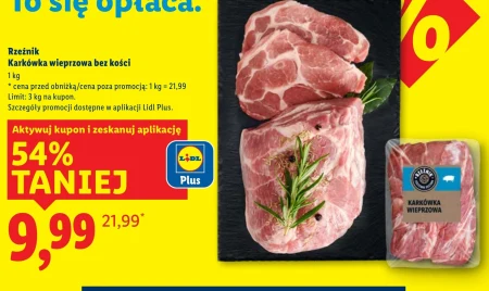 Rzeźnik Karkówka wieprzowa bez kości 1 kg * cena przed obniżką/cena poza promocją: 1 kg = 21,99 Limit: 3 kg na kupon. Szczegóły promocji dostępne w aplikacji Lidl Plus.