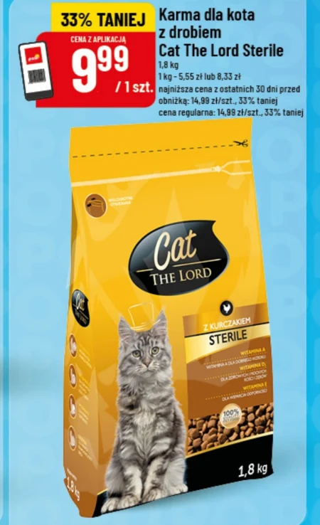 Karma dla kota z drobiem Cat The Lord Sterile 1,8 kg 1 kg - 5,55 zł lub 8,33 zł najniższa cena z ostatnich 30 dni przed obniżką: 14,99 zł/szt., 33% taniej cena regularna: 14,99 zł/szt., 33% taniej