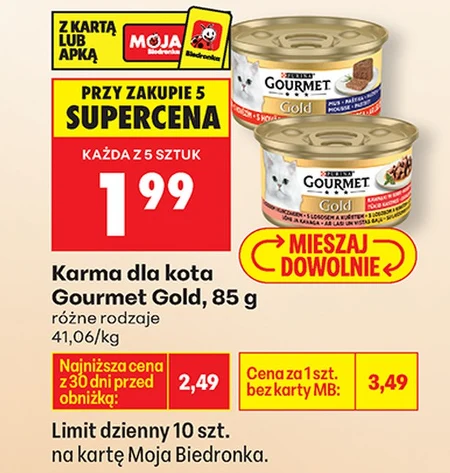 W gazetce Biedronka znajdziesz karmę dla kota Gourmet Gold w saszetkach 85 g, w różnych rodzajach, w cenie 41,06 zł za kilogram. Regularna cena za sztukę to 3,49 zł, jednak przy zakupie pięciu sztuk każda kosztuje tylko 1,99 zł z kartą Moja Biedronka lub za pomocą aplikacji. Ta wysokiej jakości karma to idealny sposób na zaspokojenie podniebienia Twojego pupila i zapewnienie mu pełnowartościowego posiłku. Limit zakupów to 10 sztuk dziennie na kartę. Skorzystaj z tej wyjątkowej oferty i poczęstuj swojego kota pyszną karmą w atrakcyjnej cenie.