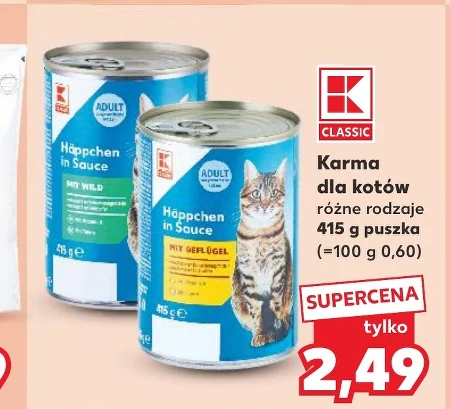 Karma dla kotów różne rodzaje 415 g puszka (=100 g 0,60) Idealnie nadaje się do codziennego karmienia kotów, dostarczając im niezbędnych składników odżywczych w formie smakowitego posiłku. Dzięki różnorodności rodzajów, zaspokoi nawet najbardziej wybredne podniebienia, co sprawi, że Twój kot będzie cieszył się pysznym jedzeniem każdego dnia.