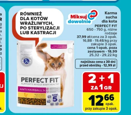 Karma sucha dla kota Perfect Fit dostępna jest w ofercie Carrefour Market w cenie 37,99 zł za 3 opakowania o gramaturze 650-750 g, co daje cenę 16,88-19,48 zł za kilogram. Dostępne są różne rodzaje karmy, w tym specjalne formuły dla kotów wrażliwych, po sterylizacji lub kastracji. Karma Perfect Fit Supports Whole Body Health™ Anti Hairball 1+ z dodatkiem mięsa i kurczaka, drobiu i łososia, jest odpowiednia również dla kotów z tendencją do tworzenia kul włosowych. Obecnie możesz skorzystać z promocji 2 + 1 za 1 grosz, dzięki której cena za opakowanie przy zakupie trzech sztuk wynosi zaledwie 12,66 zł. To wyjątkowa okazja, aby zaopatrzyć się w ulubioną karmę swojego pupila w atrakcyjnej cenie. Źródło: gazetka Carrefour Market