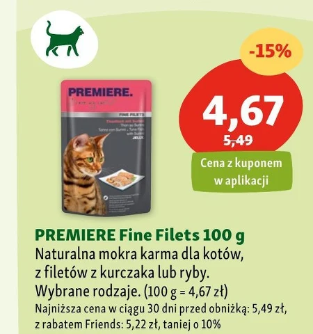 PREMIERE Fine Filets 100 g Naturalna mokra karma dla kotów, z filetów z kurczaka lub ryby. Wybrane rodzaje. (100 g = 4,67 zł) Najniższa cena w ciągu 30 dni przed obniżką: 5,49 zł, z rabatem Friends: 5,22 zł, taniej o 10%