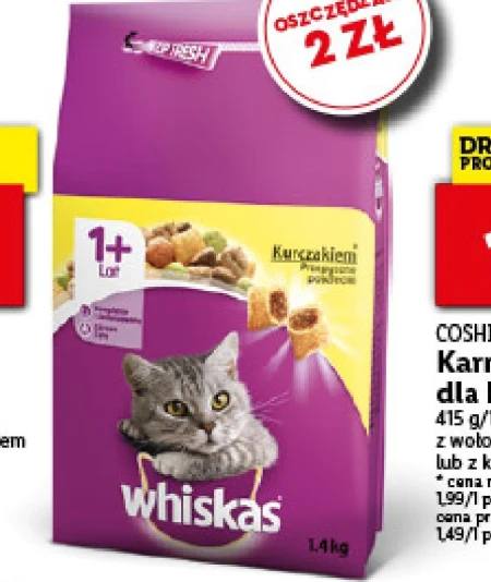 Whiskas wie, co kocha Twój kot i czego naturalnie potrzebuje. Sucha karma Whiskas 1+ to w pełni kompletny i zbilansowany pokarm, z optymalnym poziomem witamin i minerałów, stworzony by pomóc Ci troszczyć się o Twojego dorosłego kota w najlepszy możliwy sposób - Pod kątem odżywczym, nasze posiłki zapewniają Twojemu kotu wszystko czego potrzebuje, by żyć długo, zdrowo i szczęśliwie. - Pomaga czyścić zęby, dzięki lekko ścierającej strukturze. - Optymalna receptura pomaga wspierać zdrowie dróg moczowych. - Z kwasami tłuszczowymi Omega 6 i cynkiem dla zdrowej i lśniącej sierści. - Z witaminą A dla dobrego wzroku kota. Sucha karma Whiskas zawiera przepyszne paszteciki chrupiące na zewnątrz, z delikatnym i smakowitym nadzieniem wewnątrz. Opracowane przez specjalistów ds. żywienia i lekarzy weterynarii Waltham. Waltham światowy autorytet w dziedzinie pielęgnacji i żywienia zwierząt domowych