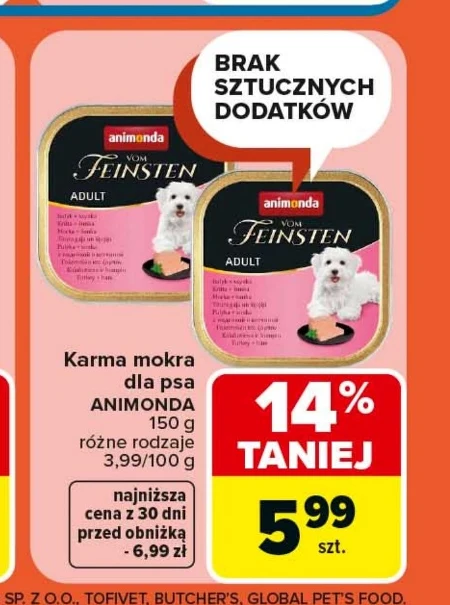 Animonda vom Feinsten ADULT, karma mokra dla psa, dostępna jest w ofercie Carrefour Market w cenie 5,99 zł za sztukę. Wcześniej kosztowała 6,99 zł, a cena za 100 g to 3,99 zł. Karma jest dostępna w opakowaniach po 150 g i występuje w różnych rodzajach, zapewniając urozmaiconą dietę dla Twojego pupila. Ten produkt to pełnowartościowy posiłek stworzony z myślą o dorosłych psach, odpowiadający na ich specyficzne potrzeby żywieniowe. Warto skorzystać z tej okazji i zaopatrzyć się w ulubiony smak Twojego czworonoga w atrakcyjnej cenie. Źródło: gazetka Carrefour Market