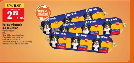 Karma w batonie dla psa Heros, w wybranej odsłonie, kosztuje 2,99 zł za sztukę przy zakupie jednej sztuki, a już za trzy opakowania zapłacisz tylko 0,33 zł za 100 g. To smaczny i wartościowy przysmak, który z pewnością umili psu chwile podczas spaceru czy treningu, wspierając jego codzienne potrzeby. Taka okazja, z 30% obniżką względem ceny regularnej 4,29 zł, pozwala zadbać o szczęście czworonożnego przyjaciela bez obciążania portfela.