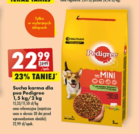 Sucha karma dla psa Pedigree 1,5 kg/2 kg 15,33/11,50 zł/kg cena referencyjna (najniższa cena w okresie 30 dni przed wprowadzeniem obnizki): 22,99 zł/opak.