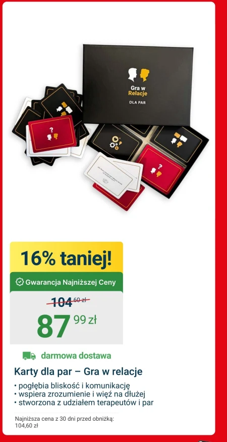 Karty dla par - Gra w relacje · pogłębia bliskość i komunikację · wspiera zrozumienie i więź na dłużej · stworzona z udziałem terapeutów i par Najniższa cena z 30 dni przed obniżką: 104,60 zł