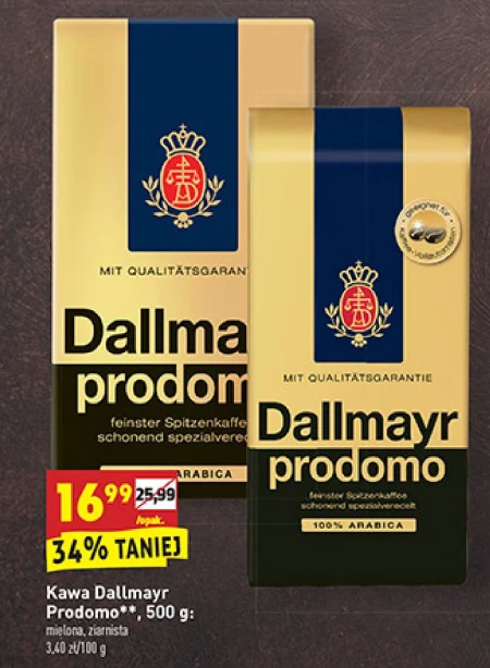 Kawa Dallmayr prodomo, waga 500 g. Mielona, ziarnista.