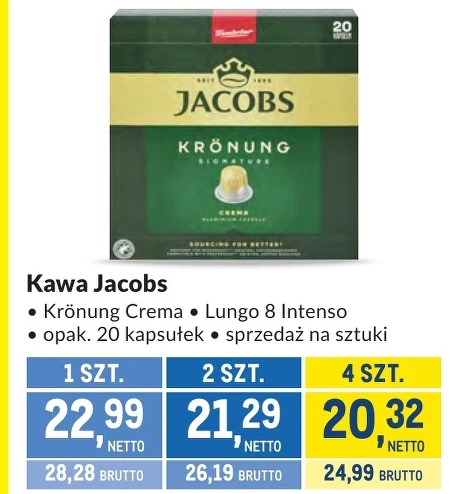 Kawa Jacobs · Krönung Crema · Lungo 8 Intenso · opak. 20 kapsułek · sprzedaż na sztuki