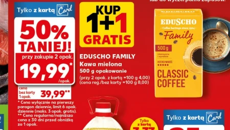 Kawa mielona Eduscho Family dostępna jest w ofercie Kaufland w opakowaniu 500 g w promocji 50% taniej, czyli 19,99 zł za opakowanie przy zakupie dwóch sztuk. To idealna propozycja dla miłośników aromatycznej kawy, którzy regularnie sięgają po ten napój. Dzięki atrakcyjnej cenie, warto zaopatrzyć się w większą ilość i cieszyć się ulubionym smakiem przez dłuższy czas. Oferta obowiązuje na pierwszy paragon dziennie, z limitem sześciu opakowań, z czego maksymalnie trzy gratis. Oferta ważna od 2026-04-09 do 2026-04-22 Źródło: gazetka Kaufland