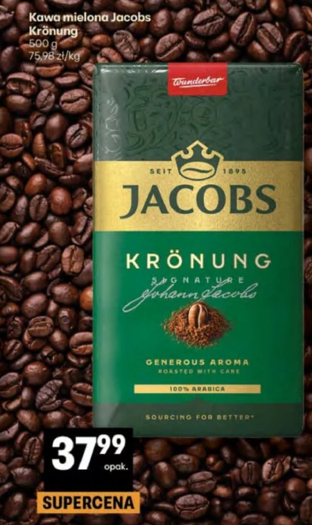 Kawa mielona Jacobs Krönung dostępna jest w Delikatesy Centrum w cenie 37,99 zł za opakowanie 500 g, co daje 75,98 zł za kilogram. To 100% Arabica, starannie palona, by zapewnić bogaty aromat i wyrazisty smak. Idealna do codziennego parzenia, doskonale sprawdzi się zarówno w ekspresie, jak i przyrządzana tradycyjnymi metodami. Wyjątkowa okazja, aby zaopatrzyć się w ulubioną kawę w korzystnej cenie. Ważność: 2026-04-02 – 2026-04-08 Źródło: gazetka Delikatesy Centrum