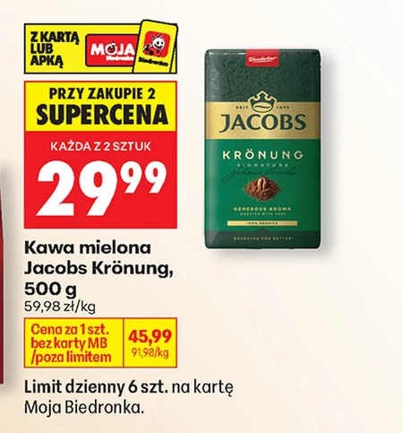 Kawa mielona Jacobs Krönung, 500 g Z KARTĄ LUB APKĄ MÓJA BIEDRONKA PRZY ZAKUPIE 2 SUPERCENA KAŻDA Z 2 SZTUK 29,99 59,98 zł/kg Cena za 1szt. bez karty MB /poza limitem 45,99 przekreślona 91,98 zł/kg Limit dzienny 6 szt. na kartę Moja Biedronka.