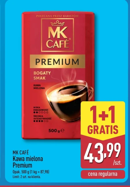 MK CAFÉ Kawa mielona Premium Opak. 500 g (1 kg = 87,98] Limit: 2 szt. na klienta. Kawę mieloną MK CAFÉ Premium doskonale można wykorzystać do parzenia aromatycznego espresso, które pobudzi zmysły i nada energii na cały dzień. Dzięki jej wysokiej jakości, staje się idealnym wyborem dla miłośników intensywnego smaku oraz bogatego aromatu, idealnym do przygotowania klasycznych kawowych napojów.