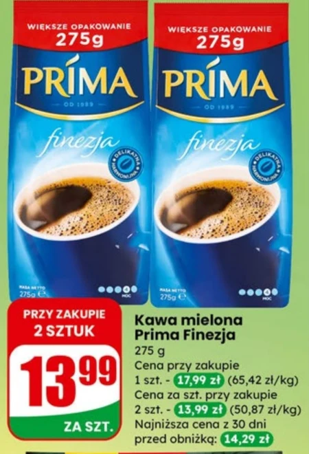 Kawa mielona Prima Finezja 275 g Cena przy zakupie 1 szt. - 17,99 zł (65,42 zł/kg) Cena za szt. przy zakupie 2 szt. - 13,99 zł (50,87 zł/kg) Najniższa cena z 30 dni przed obniżką: 14,29 zł