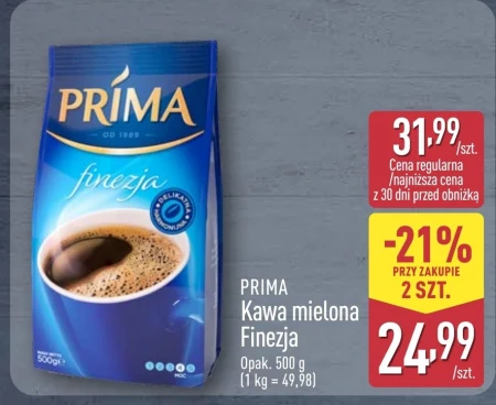 PRIMA Kawa mielona Finezja Opak. 500 g (1 kg = 49,98) Kawa mielona PRIMA Finezja doskonale sprawdzi się jako aromatyczny dodatek do porannego rytuału picia kawy, zapewniając niepowtarzalny smak i intensywny aromat. Można ją wykorzystać do przygotowania różnych napojów kawowych, takich jak espresso czy latte, a także do wypieków, które zyskują wyrazisty coffee flavor.