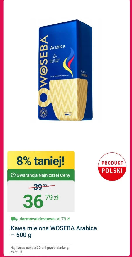 Kawa mielona WOSEBA Arabica - 500 g Najniższa cena z 30 dni przed obniżką: 39,99 zł