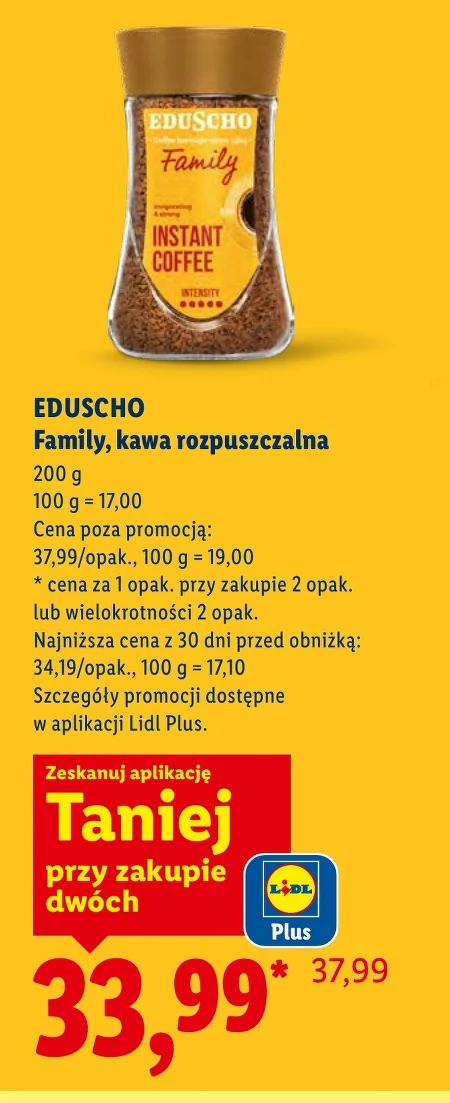 EDUSCHO Family, kawa rozpuszczalna 200 g 100 g = 17,00 Cena poza promocją: 37,99/opak., 100 g = 19,00 * cena za 1 opak. przy zakupie 2 opak. lub wielokrotności 2 opak. Najniższa cena z 30 dni przed obniżką: 34,19/opak., 100 g = 17,10 Szczegóły promocji dostępne w aplikacji Lidl Plus.
