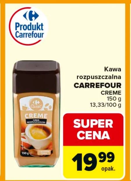 Kawa rozpuszczalna Carrefour Creme dostępna jest teraz w promocji za 19,99 zł za opakowanie 150 g. To doskonała okazja, aby zaopatrzyć się w ulubiony napój – cena 13,33 zł za 100 g sprawia, że jest to wyjątkowo korzystna oferta w Carrefour. Wykorzystasz ją do szybkiego przygotowania porannej kawy lub energetycznego napoju w ciągu dnia. Sprawdź gazetkę Carrefour i skorzystaj z super ceny już dziś.