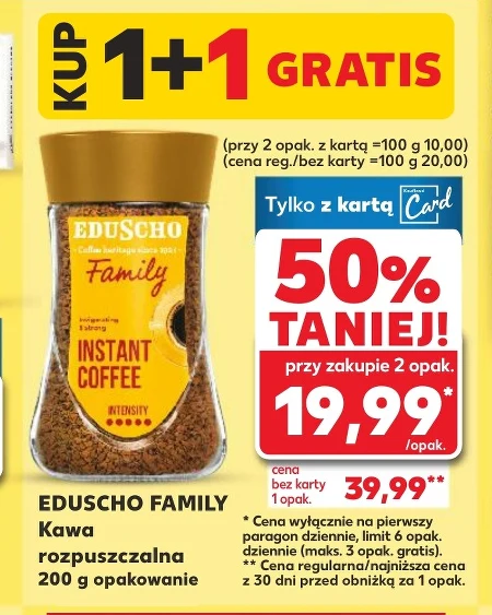 EDUSCHO FAMILY Kawa rozpuszczalna 200 g opakowanie * Cena wyłącznie na pierwszy paragon dziennie, limit 6 opak. dziennie (maks. 3 opak. gratis). ** Cena regularna/najniższa cena z 30 dni przed obniżką za 1 opak.