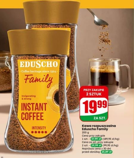 Kawa rozpuszczalna Eduscho Family 200 g Cena przy zakupie 1 szt. - 37,99 zł (189,95 zł/kg) Cena za szt. przy zakupie 2 szt. - 19,99 zł (99,95 zł/kg) Najniższa cena z 30 dni przed obniżką: 25,89 zł