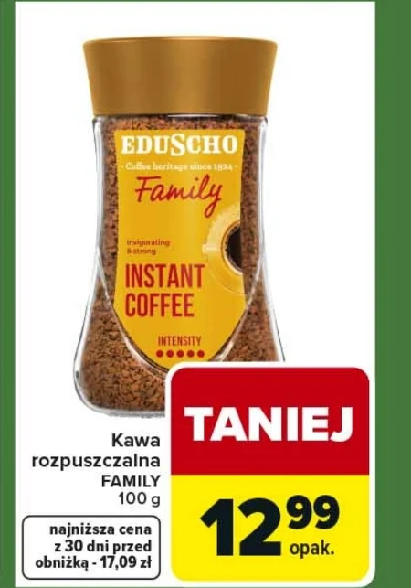 Kawa rozpuszczalna FAMILY jest dostępna w ofercie Carrefour Express w cenie 12,99 zł za opakowanie o gramaturze 100 g. To popularny wybór dla osób ceniących szybki i łatwy sposób na przygotowanie filiżanki kawy o wyrazistym smaku. Doskonale sprawdzi się każdego ranka lub w trakcie dnia, by dodać energii. Cena ta jest najkorzystniejsza z ostatnich 30 dni – wcześniej produkt kosztował 17,09 zł, co stanowi zauważalną obniżkę i dobrą okazję do zaopatrzenia się w ulubioną kawę. Oferta ważna od 2026-04-07 do 2026-04-11 Źródło: gazetka Carrefour Express