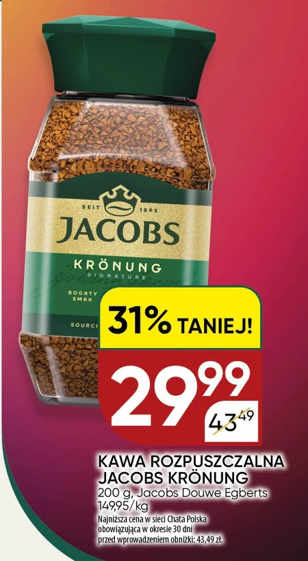 KAWA ROZPUSZCZALNA JACOBS KRONUNG 200 g, Jacobs Douwe Egberts 31% TANIEJ! 29,99 Najniższa cena w sieci Ostatnich 30 dni obowiązująca w wylosie 30 dni przed wprowadzeniem obniżki: 43,49 zł / 1 kg Kawa Jacobs Kronung to klasyczny wybór dla miłośników rozpuszczalnej kawy, znany z bogatego aromatu i smaku. Idealna do szybkiego przygotowania pobudzającej filiżanki, sprawdzi się zarówno w domu, jak i w pracy. Obecnie dostępna w obniżonej cenie, co czyni ją atrakcyjną propozycją dla regularnych użytkowników lub osób poszukujących sprawdzonej jakości. Pasuje do porannej rutyny, jako chwila relaksu, a także jako podstawa do kawowych napojów, np. latte czy cappuccino – jak w Chacie Polskiej!Włącz powiadomienia o ulubionych produktach:
