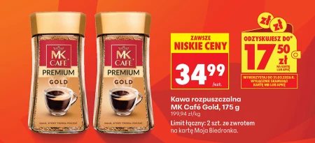 Kawa rozpuszczalna MK Café Gold w Biedronce kosztuje 34,99 zł za opakowanie 175 g, co daje cenę 199,94 zł/kg. Przy zakupie do 31 marca 2026 roku, skanując kartę Moja Biedronka lub aplikę, można odzyskać do 17,50 zł na kartę, przy limicie 2 sztuk. Idealnie sprawdzi się do szybkiego przygotowania ulubionej kawy o poranku. Promocja dostępna w najnowszej gazetce Biedronka.